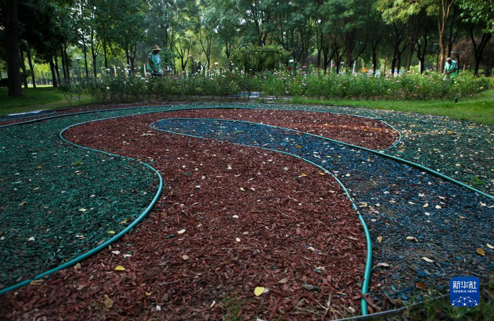 9月7日在德州市行政中心绿地拍摄的用园林绿化垃圾循环再造的园林景观。
