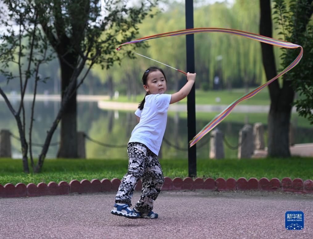 9月7日,小朋友在德州市行政中心绿地挥舞彩带。
