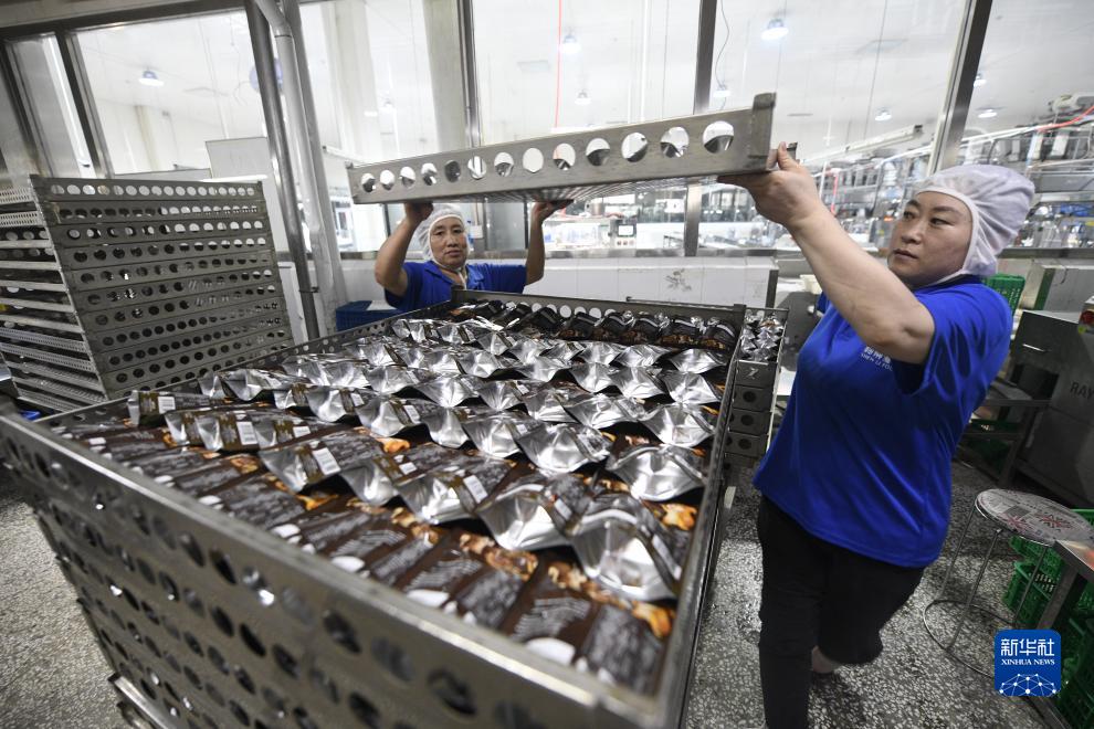 9月8日,在宽城县一家板栗深加工企业,工人将板栗产品装盘准备进行消毒。