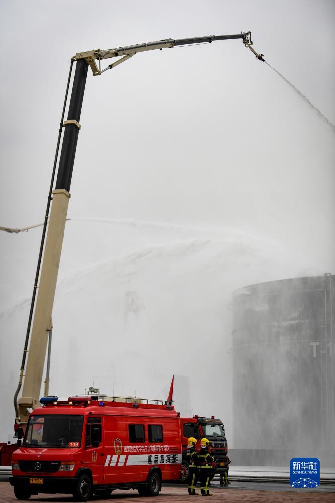 9月8日,在实战灭火演练现场,大跨度高喷消防车对甲醇储罐进行冷却灭火。