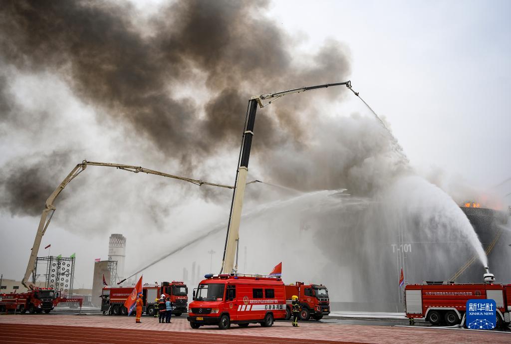 9月8日,在实战灭火演练现场,大跨度高喷消防车对甲醇储罐进行冷却灭火。