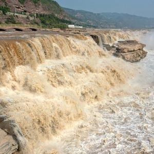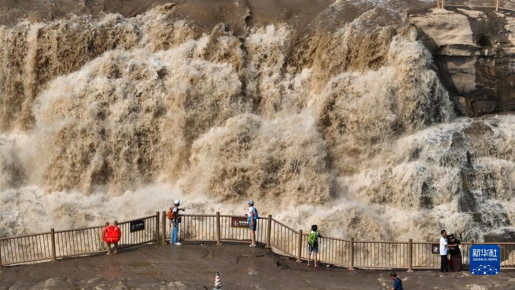 近日,受上游降雨和水库调节放水影响,黄河壶口瀑布主副瀑布连成一线,滚滚黄河水奔腾而下,吸引游客驻足观看。