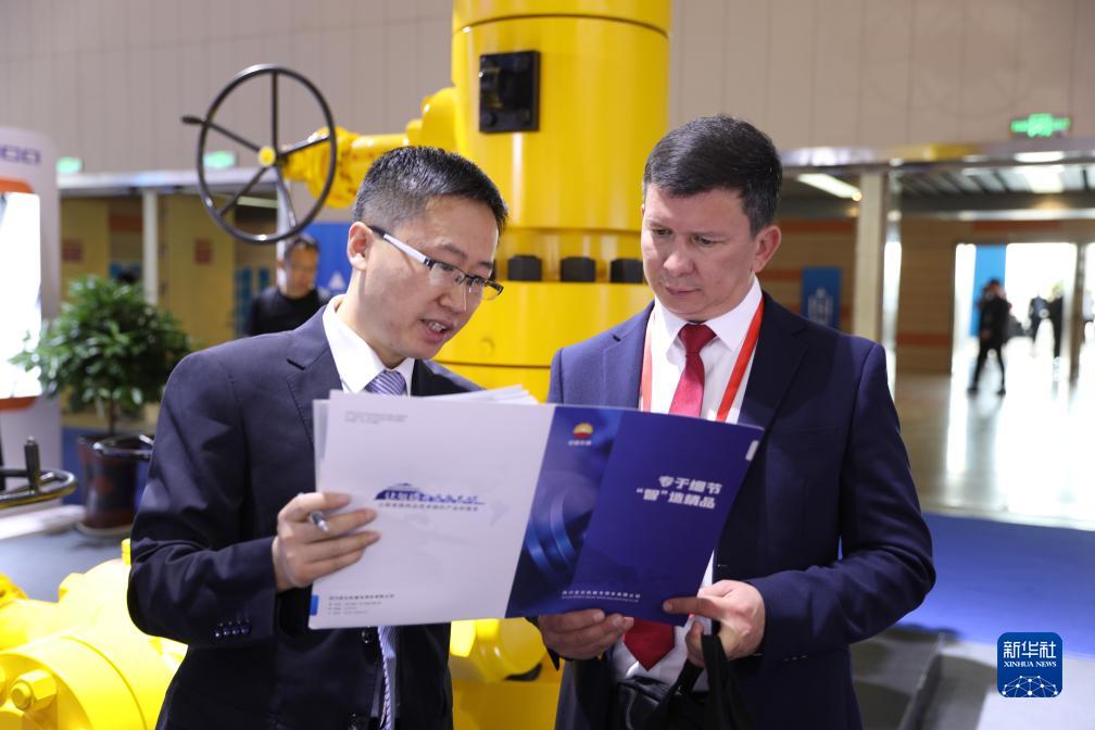 9月8日,来自哈萨克斯坦的嘉宾(右)在展览会上与参展商交流产品情况。