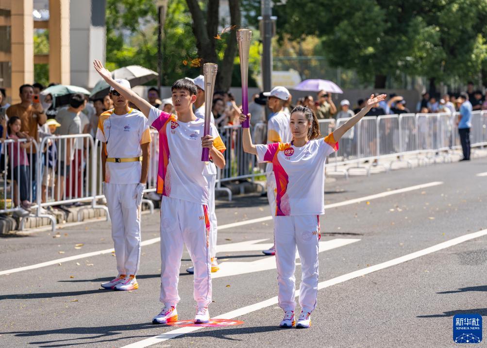9月9日,火炬手戴丹丹(右)和马瑞麟在火炬传递中。