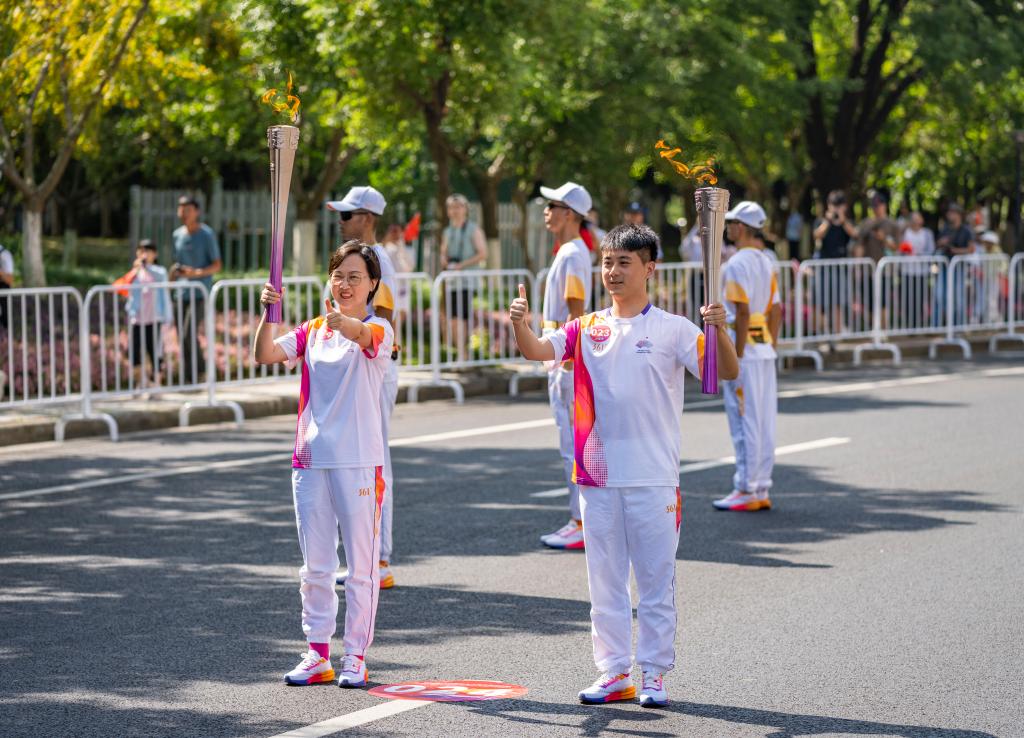 9月9日,火炬手钱智权(右)和张珊在火炬传递中。