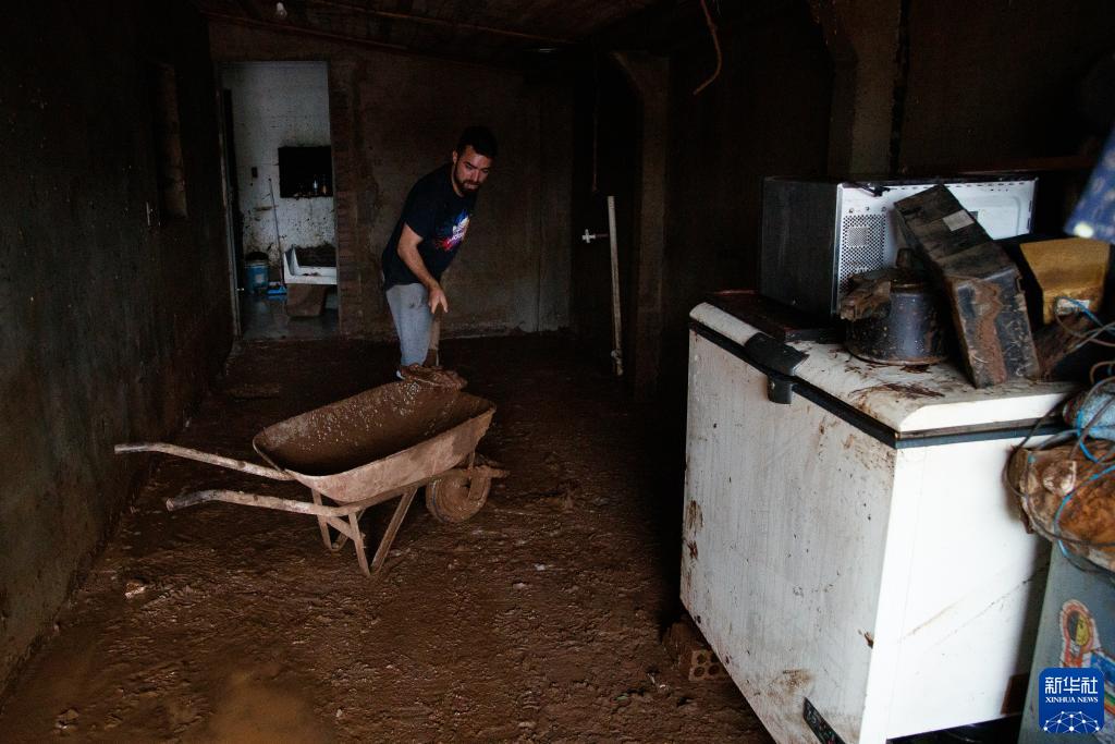9月8日,在巴西南里奥格兰德州埃斯特雷拉,一名男子清理家中的淤泥。