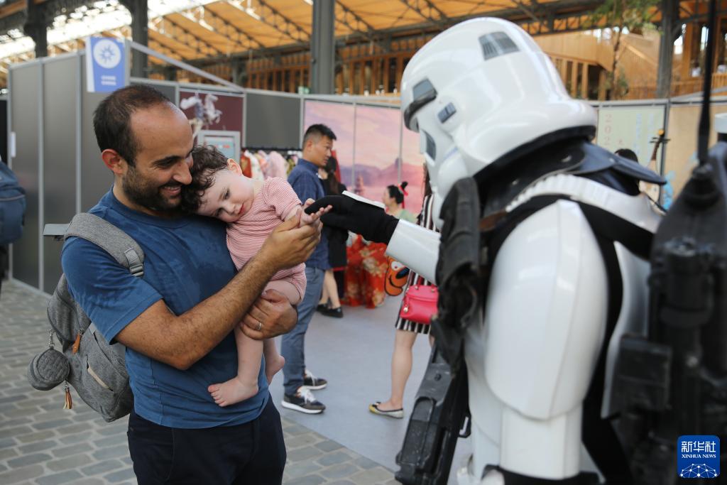 9月8日,在比利时布鲁塞尔,扮成《星球大战》系列作品人物形象的工作人员与小朋友互动。