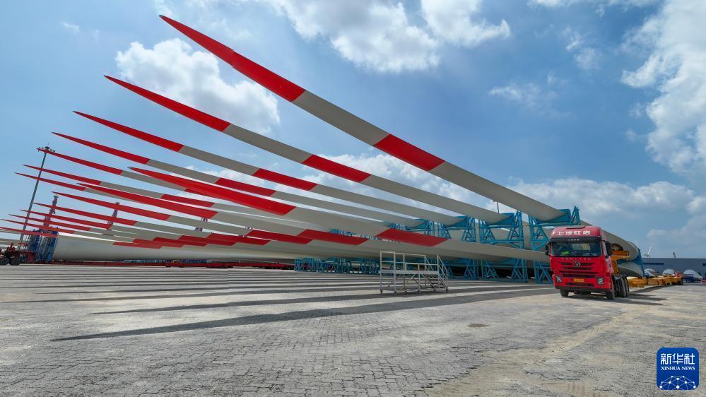 一批风电叶片在江苏盐城港射阳港区码头等待运输(9月8日摄,无人机照片)。
