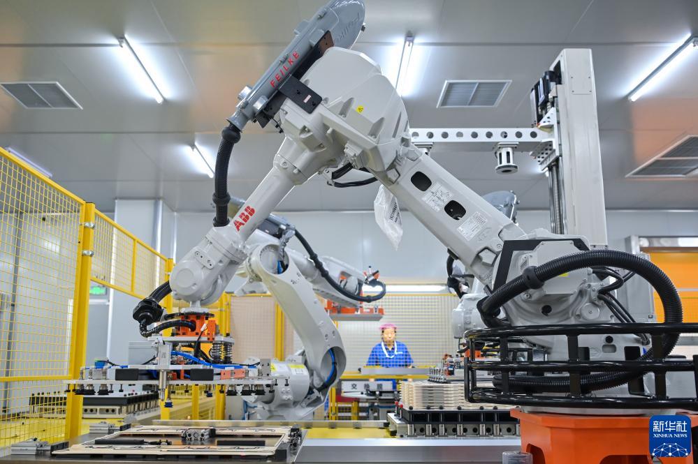 智能机器人在纬景储能盐城智造基地生产车间进行锌铁液流电池电堆总装堆叠作业(9月8日摄)。