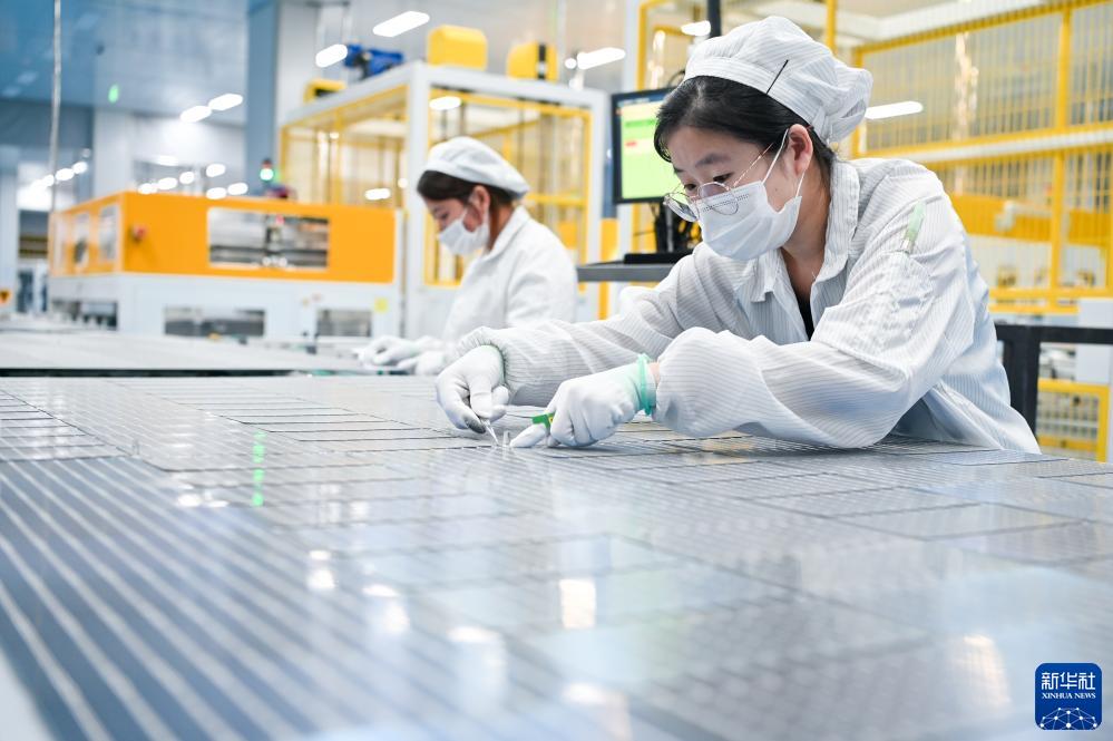 工人在江苏省盐城市建湖县悦阳光伏科技有限公司生产车间内作业(9月6日摄)。