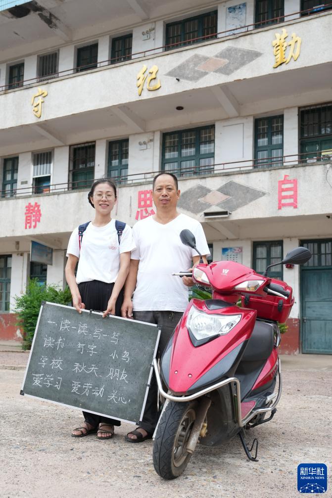 9月7日,陈艳辉(左)和父亲陈二文拿着上门送教时使用的小黑板在湖南省株洲市界首中心小学白洲教学点留影。