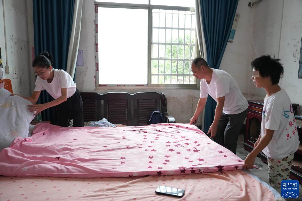 9月7日,陈艳辉(左)和陈二文(中)在湖南省株洲市茶陵县界首镇大新村的小美家中带小美做家务。小美先天智力障碍,陈艳辉和陈二文教她生活常识,小美基本学会了扫地、洗衣、做饭。新华社记者 薛宇舸 摄
