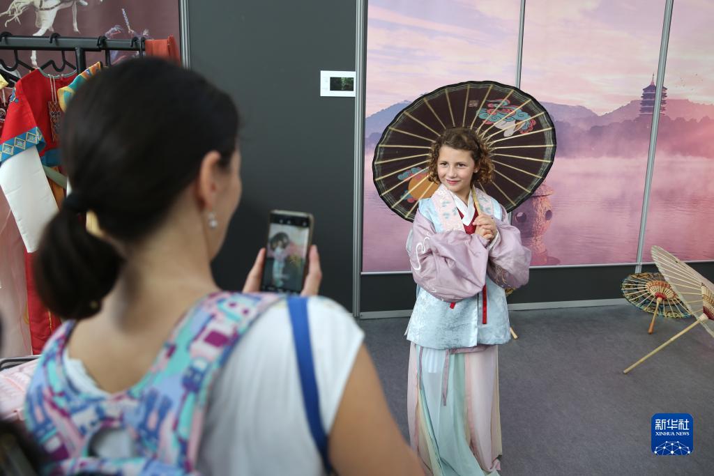 9月8日,在比利时布鲁塞尔漫画节中国馆展区,小朋友身着汉服拍照。