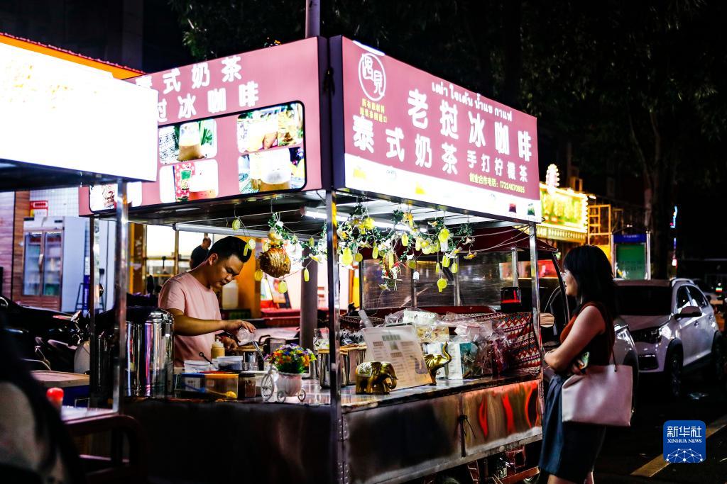 9月8日,市民在广西南宁的夜市上购买东南亚特色饮品。