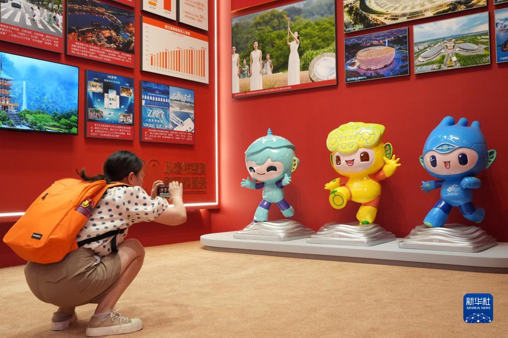 9月9日,参观者在大道之行——“八八战略”实施20周年大型主题展览上拍摄杭州亚运会吉祥物。