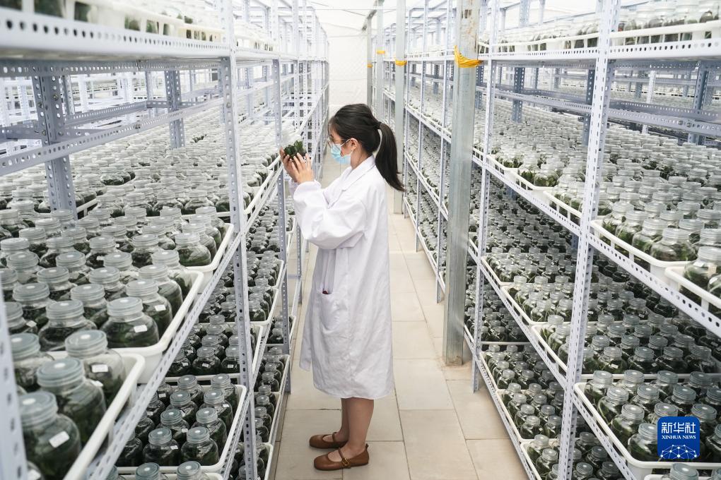 9月9日,技术人员在宿迁市王官集镇蝴蝶兰大世界查看瓶苗生长情况。