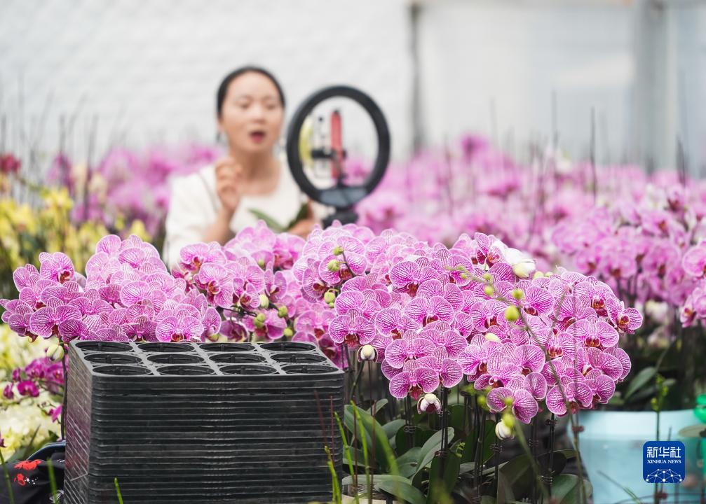 9月9日,工作人员在宿迁市王官集镇蝴蝶兰大世界大棚内进行网络直播。