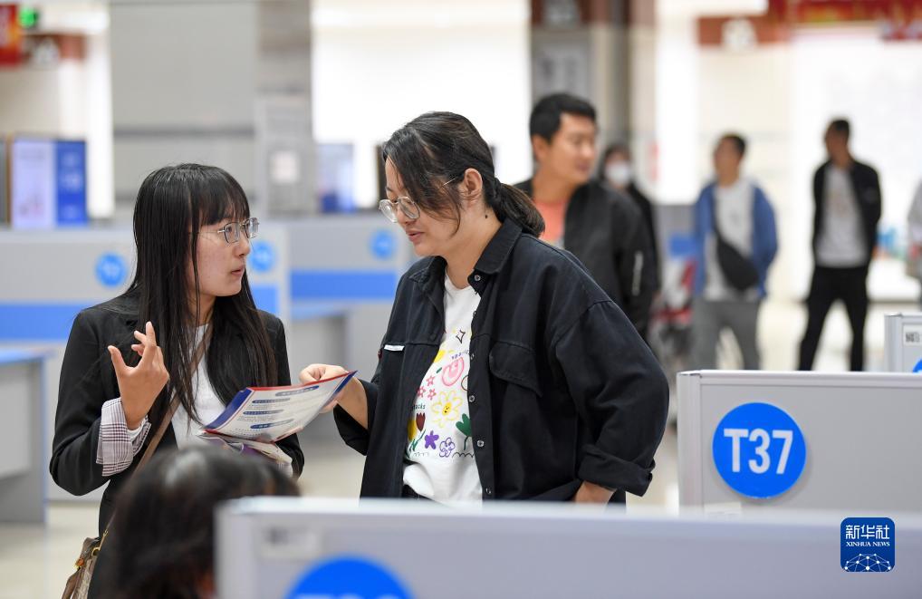 9月9日,求职者(左)在招聘会现场与用人单位工作人员交流。