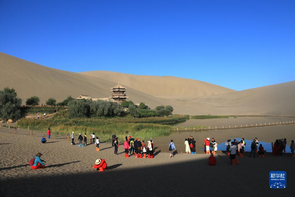 9月9日,游客在甘肃省敦煌市鸣沙山月牙泉景区游览。
