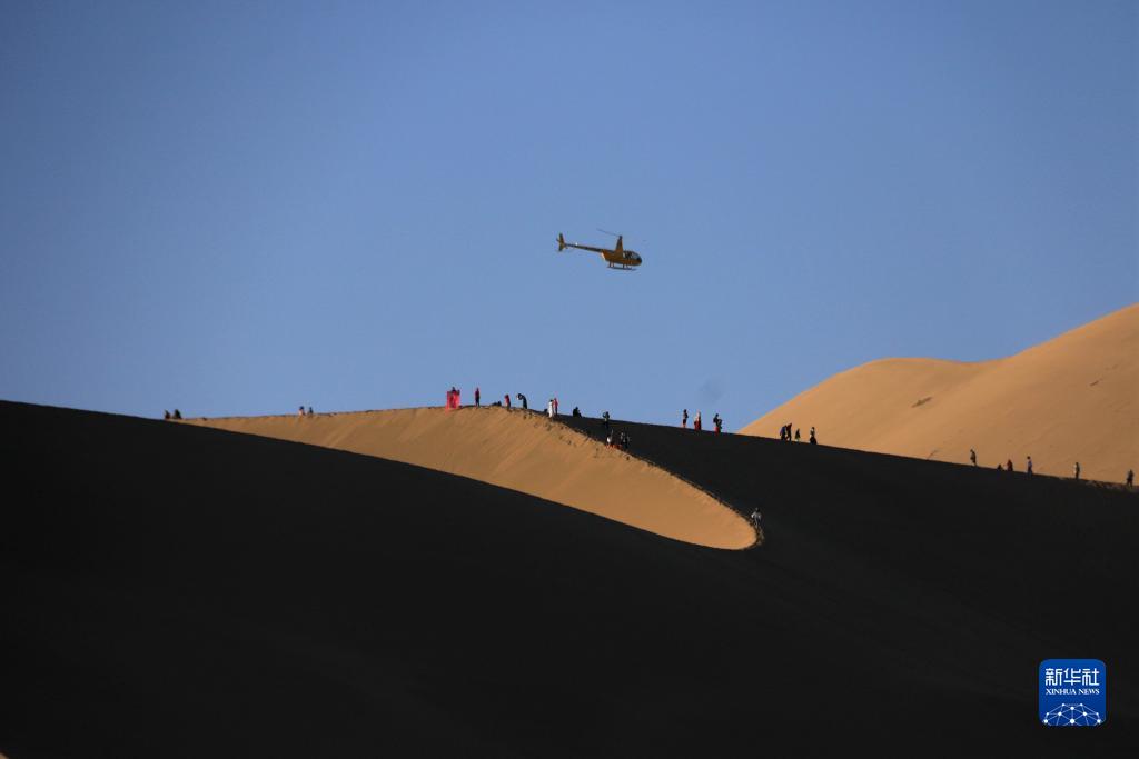 9月9日,游客在甘肃省敦煌市鸣沙山月牙泉景区游览。