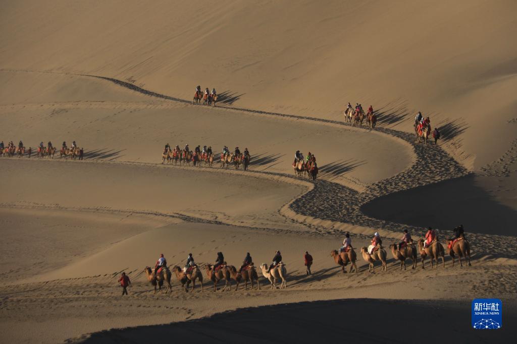 9月9日,游客在甘肃省敦煌市鸣沙山月牙泉景区游览。