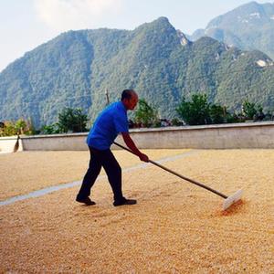 9月9日,秭归县九畹溪镇穿心店村的村民在翻晒玉米。