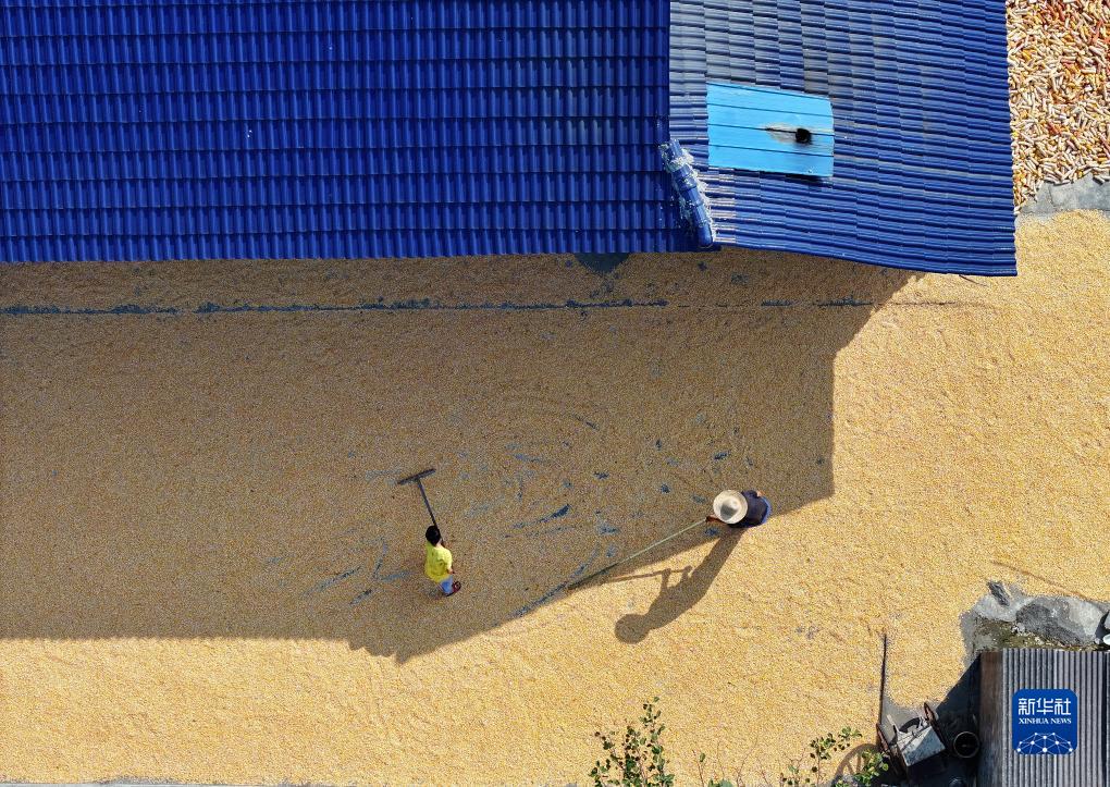 9月9日,秭归县九畹溪镇穿心店村村民在翻晒收获的玉米(无人机照片)。