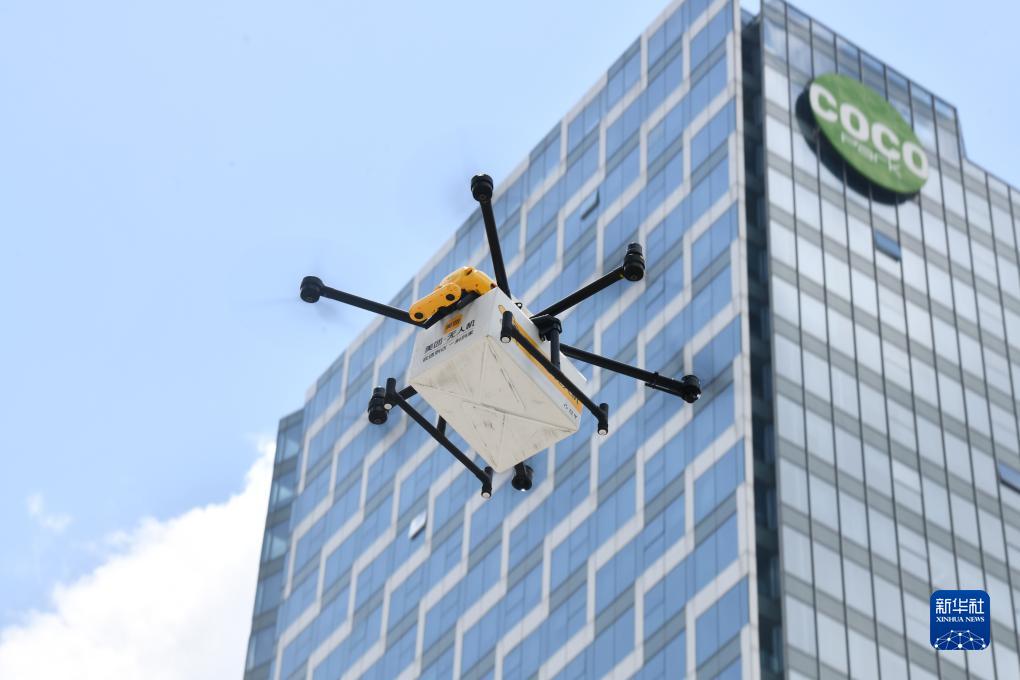 在深圳市龙岗区,一架送餐无人机穿行在高楼大厦间(8月15日摄)。