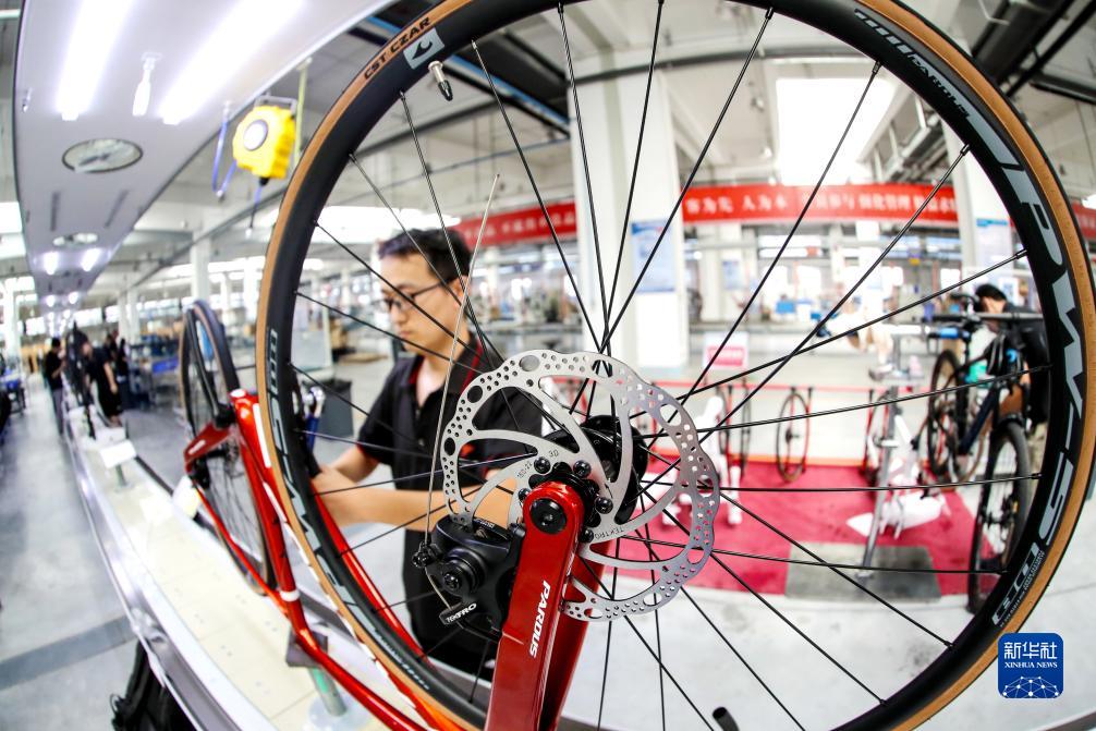 9月9日,在山东乐陵市一家企业的碳纤维自行车生产车间,质检员在组装线检验自行车产品。新华社发(张进刚 摄)