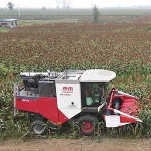 9月9日,收割机在盐山县小营乡王姑娘村的盐碱地上收割高粱。