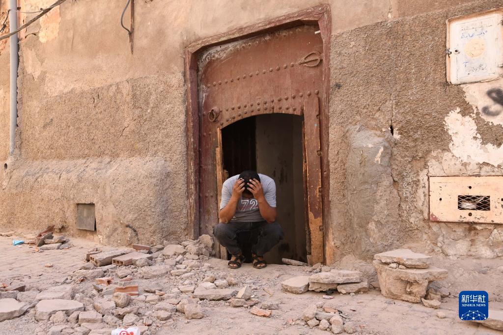9月9日,在摩洛哥南部城市马拉喀什,一名男子蹲在自家门口。