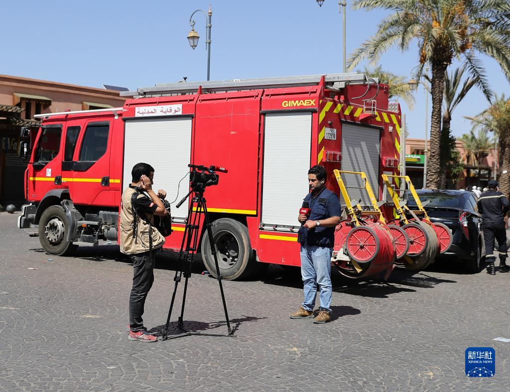 9月9日,在摩洛哥南部城市马拉喀什,媒体记者进行现场报道。