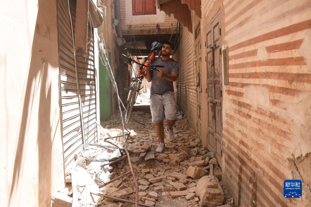 9月9日,在摩洛哥南部城市马拉喀什,一名男子走在震后的街道上。
