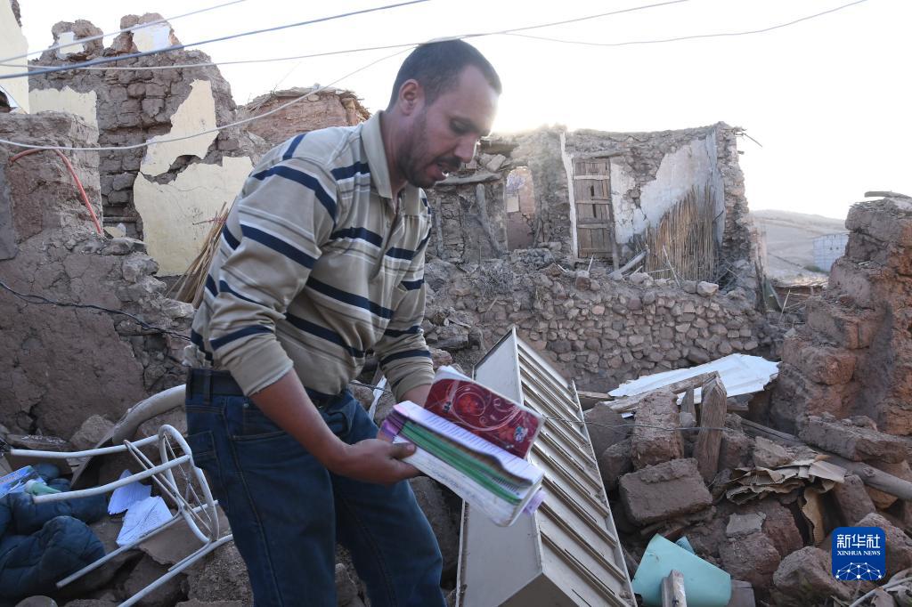 9月9日,在摩洛哥马拉喀什附近,居民查看遭地震损毁的自家房屋。