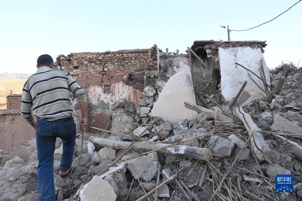 9月9日,在摩洛哥马拉喀什附近,居民走在遭地震损毁的建筑废墟上。