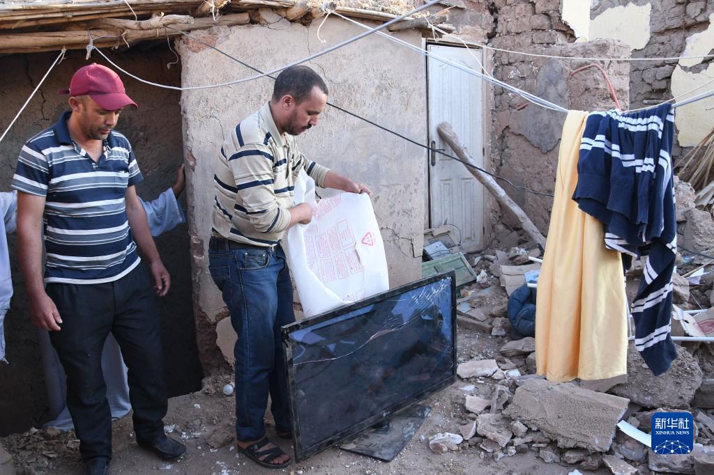 9月9日,在摩洛哥马拉喀什附近,居民整理遭地震损毁的个人物品。