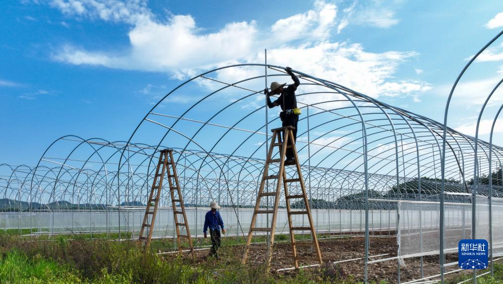9月9日,工人在常宁市洋泉镇巷坪村智慧育苗大棚施工现场施工。