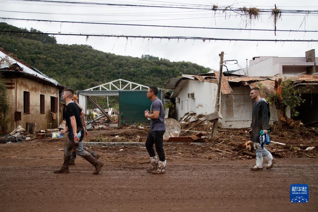 9月9日,在巴西南里奥格兰德州穆孙市,人们走过遭损毁的建筑。