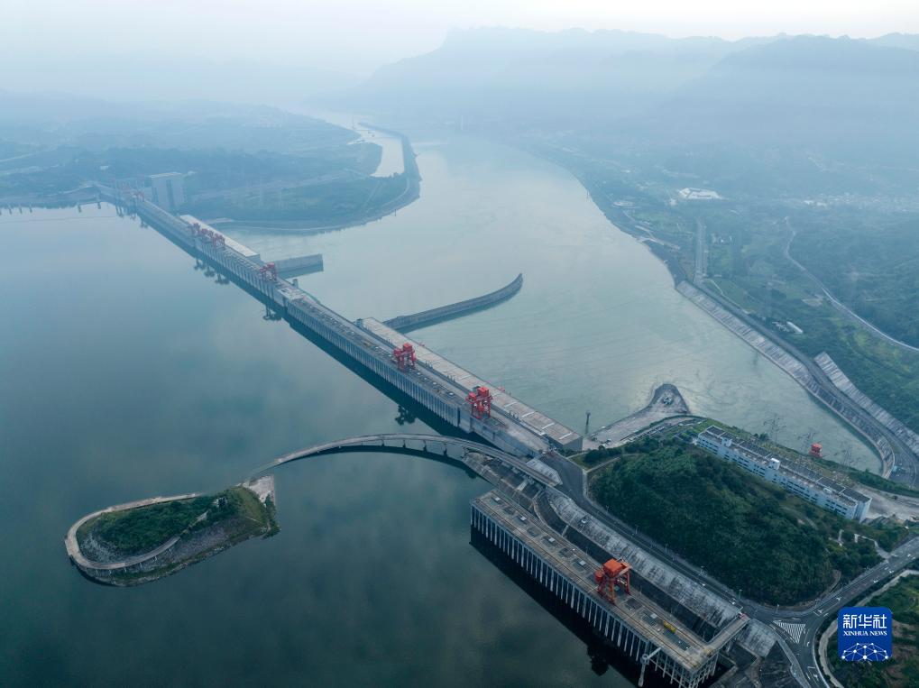 9月10日在湖北省宜昌市拍摄的蓄水运行中的三峡水利枢纽工程(无人机照片)。