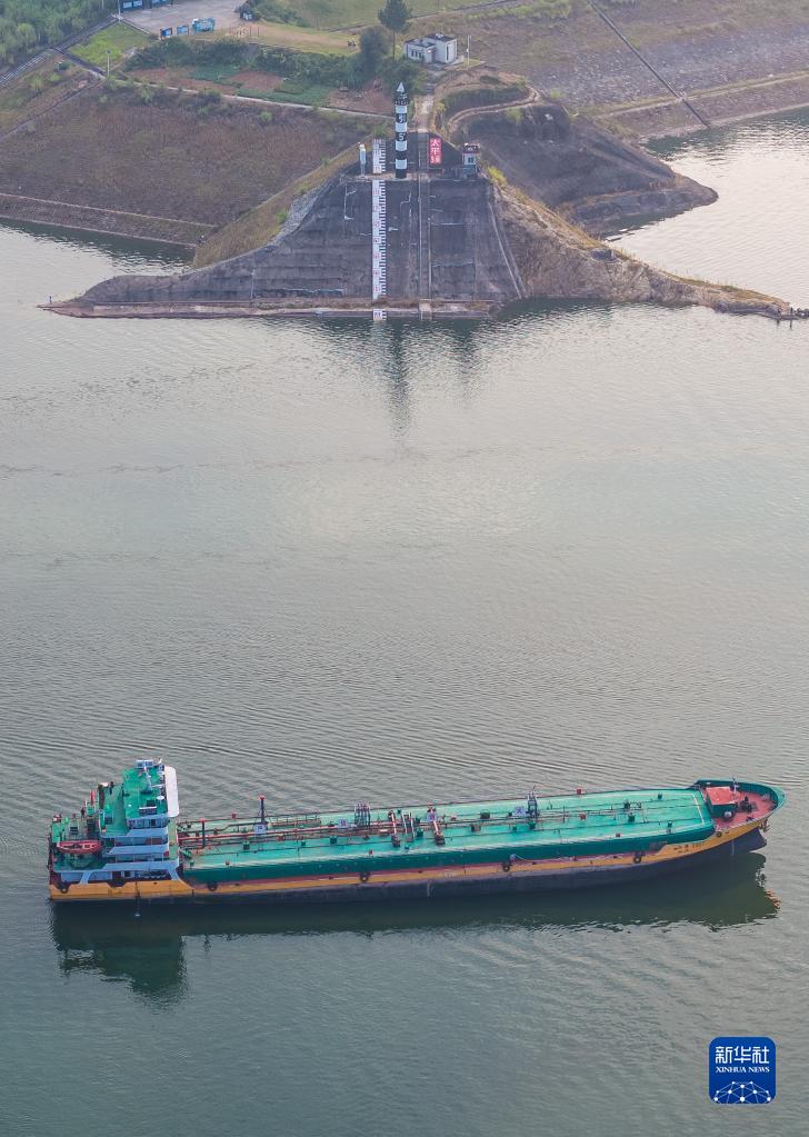 9月10日,船舶从三峡大坝上游长江水文标尺前开过(无人机照片)。