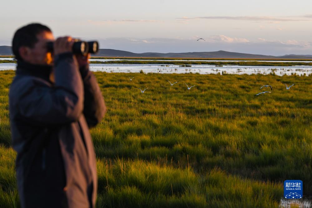 湿地生态管护员如科在四川省阿坝藏族羌族自治州若尔盖县花湖用望远镜观察周边环境(8月22日摄)。