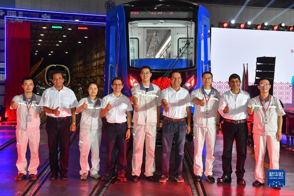 9月10日,墨西哥来宾和中车株机公司工作人员在中国中车出口墨西哥城轻轨列车首列车前合影。