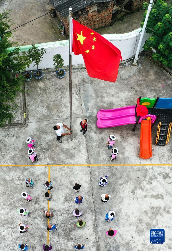陆成文与学生在教学点升旗(9月7日摄,无人机照片)。