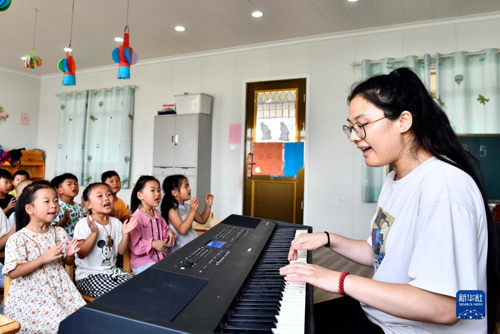 9月5日,在微山县高楼乡渭河小学,音乐老师刘梦然在教学前班的孩子们唱儿歌。