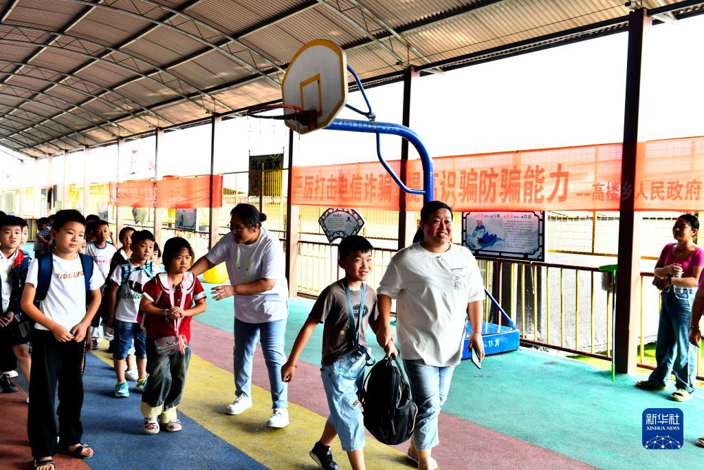 9月5日,在微山县高楼乡渭河小学,家长接孩子放学。