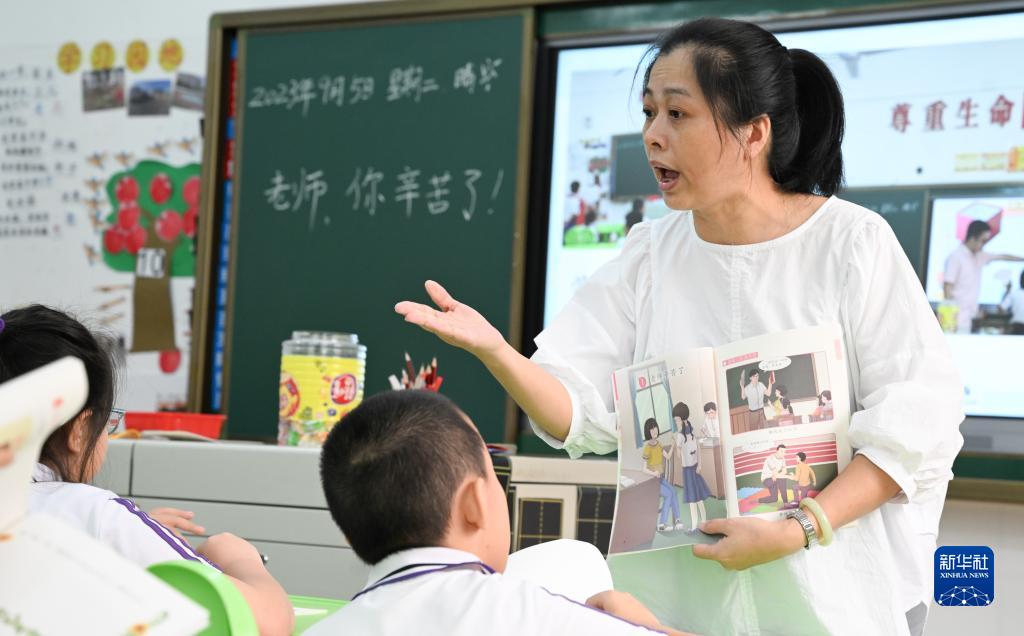 在海南(海口)特殊教育学校启智三(1)班,班主任符尧惠为学生们上课(9月5日摄)。