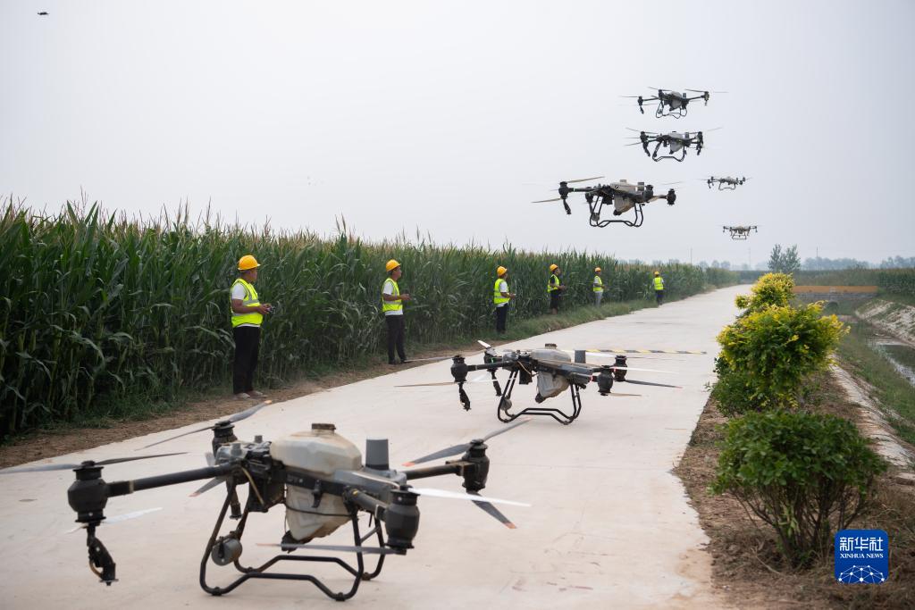 9月9日,乐陵市孔镇镇飞防作业社会化服务团队在“吨半粮”核心区内进行飞防。