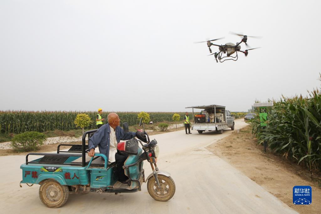 9月9日,乐陵市孔镇镇飞防作业社会化服务团队在“吨半粮”核心区内进行飞防。
