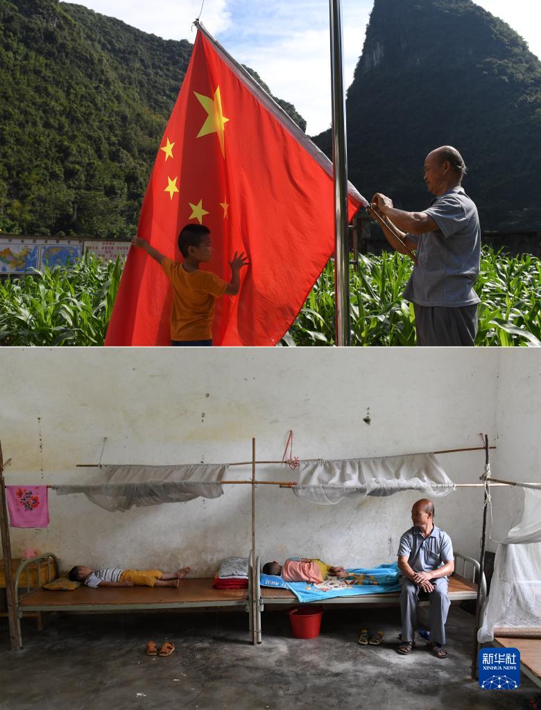 拼版照片:广西都安瑶族自治县龙湾乡琴棋小学的黄若珍老师(右)和学生准备升国旗(上图),黄若珍老师看护学生睡午觉(下图)(2017年8月31日摄)。当时,准备退休的黄若珍老师在这片大山讲台上已经坚守整整40年,学校有学生寄宿,他每天除了给学生上课,还要给他们做饭,管他们的休息。