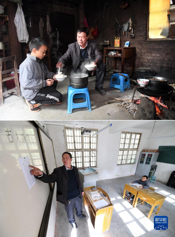 拼版照片:刘显岳老师在广西环江毛南族自治县龙岩乡朝阁村的家里给学生周雄打饭(上图),朝阁小学的刘显岳老师给学生周雄上课(下图)(2019年12月4日摄)。朝阁小学曾经有百余名学生,到2019年12月只剩下时年58岁的老师刘显岳和学生周雄,成了一所“一师一生”的学校,周雄每周星期一到星期五住在学校,其间学习生活由刘显岳老师照顾。